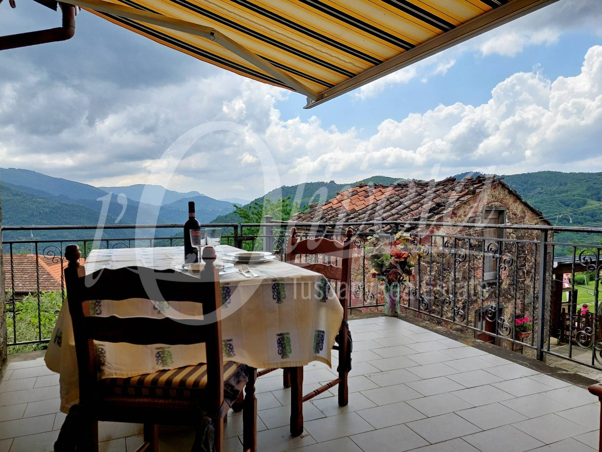 It consists on the ground floor of service rooms, including a large woodshed with access to the garden and a boiler room/laundry room, on the first floor of an entrance from a balcony shared with another property, living room with fireplace, kitchen, hallway, large living/dining room, terrace with view over the valley. A spiral staircase leads from the terrace to the garden. On the upper floor there are two bedrooms, one 20 sq m double and one single, plus a bathroom with shower and window. Non-habitable attic reached by retractable ladder. Heating with radiators fed by a wood-fired boiler. Wooden windows with double glazing and aluminium shutters. Chestnut and walnut doors. Electrical system removable. Connected to the public sewage system and aqueduct. Renoved in 1986. It is sold furnished. There is a grocery store/bar in the village.