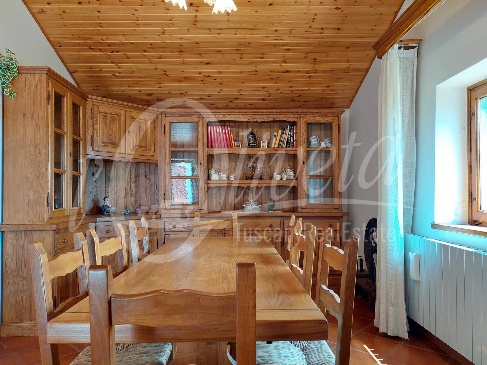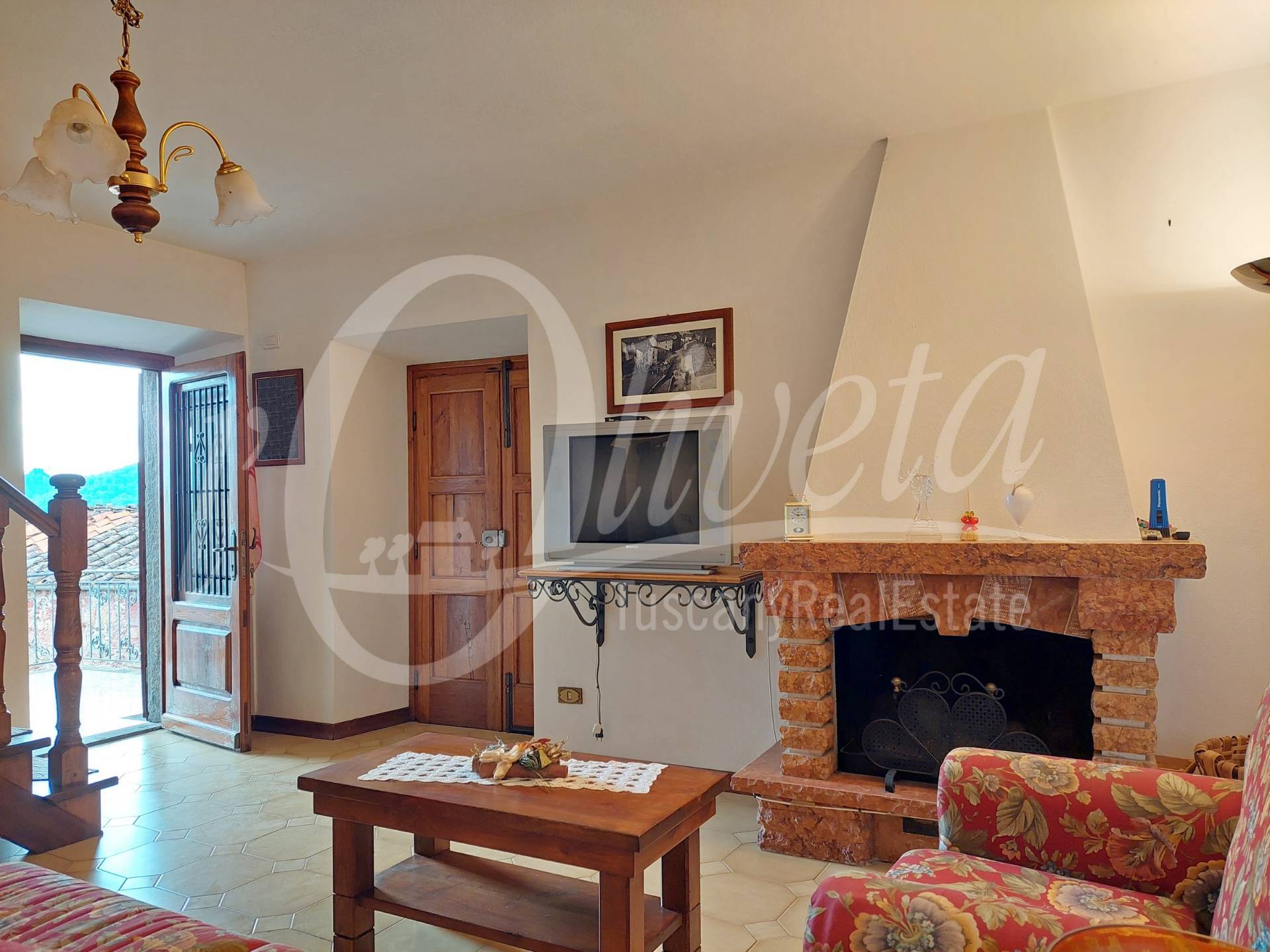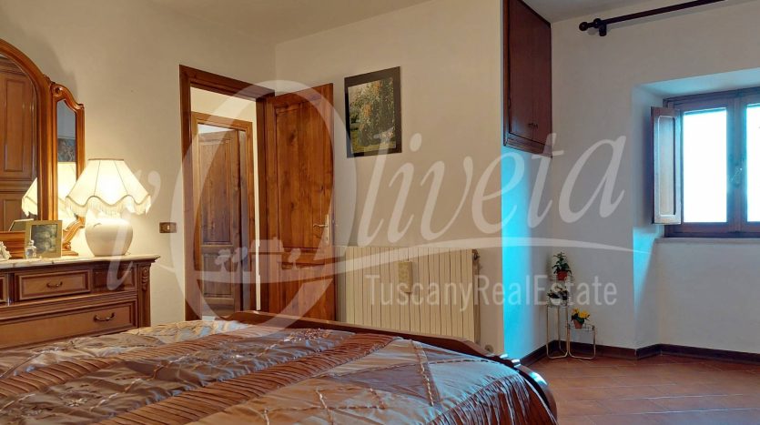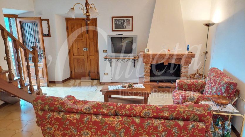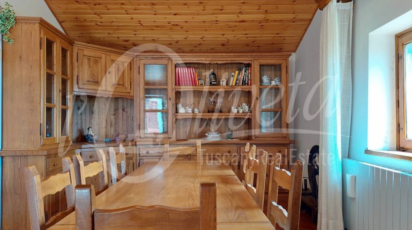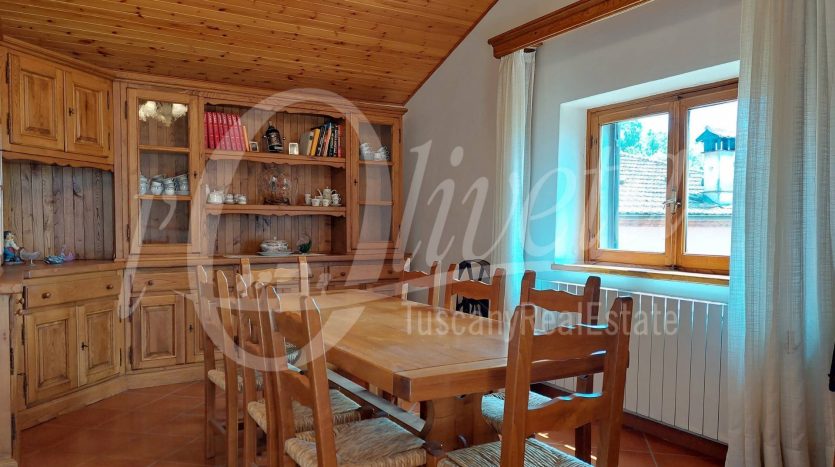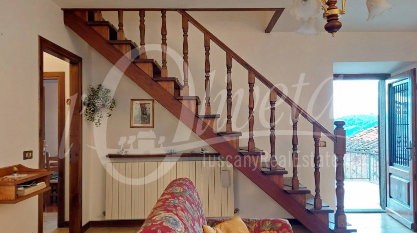 Si compone al piano terra da locali di servizio, fra cui una grande legnaia con accesso al giardino e un locale caldaia/lavanderia, al piano primo da ingresso da ballatoio in comune con altra proprietà, soggiorno con caminetto, cucina, disimpegno, grande soggiorno/pranzo, terrazza con vista sulla vallata. Da quest’ultima si accede al giardino tramite una scala a chiocciola. Al piano superiore due camere di cui una matrimoniale di 20 mq. e una singola, oltre ad un bagno con doccia e finestra. Sottotetto non abitabile raggiungibile tramite scala retrattile. Riscaldamento con termosifoni alimentati da caldaia a legna. Finestre in legno con doppi vetri e persiane in alluminio. Porte in castagno e noce. Impianto elettrico sfilabile. Allacciato alla fognatura pubblica e all’acquedotto. Ristrutturato nel 1986. Si vende arredata. In paese è presente un negozio di alimentari/bar.