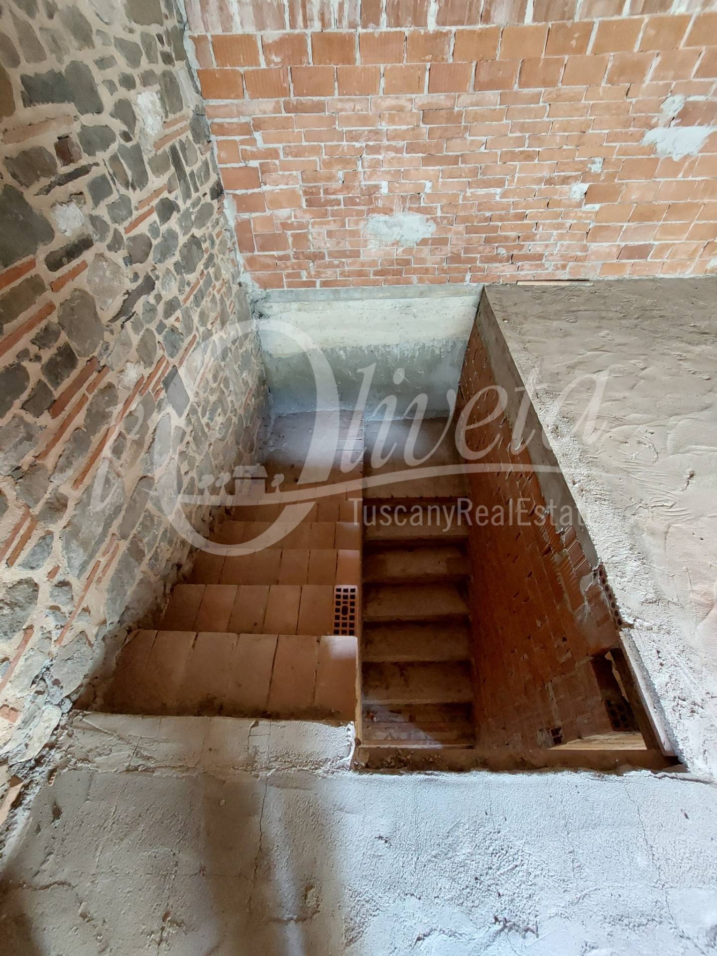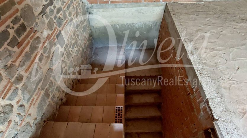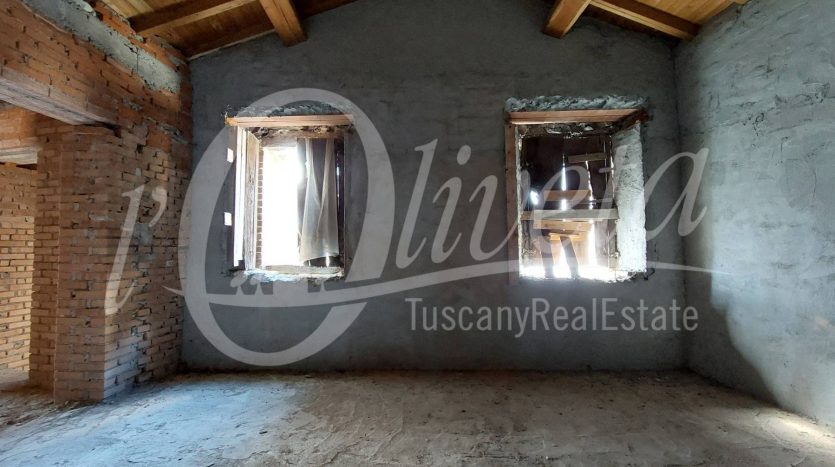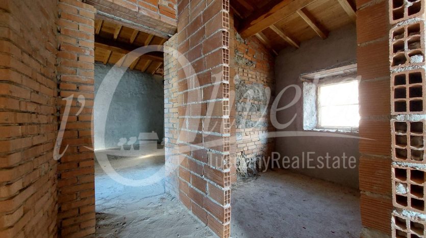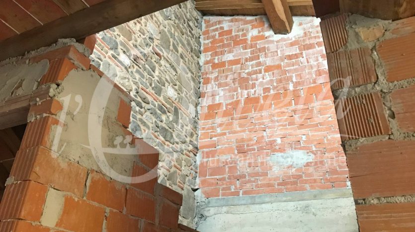 The house has a total useful surface area of 107 sq m, plus 16 sq m of accessory rooms. It is unfinished, as it lacks all the finishes, plaster, tiling, fixtures and fittings and everything else that makes a house habitable.