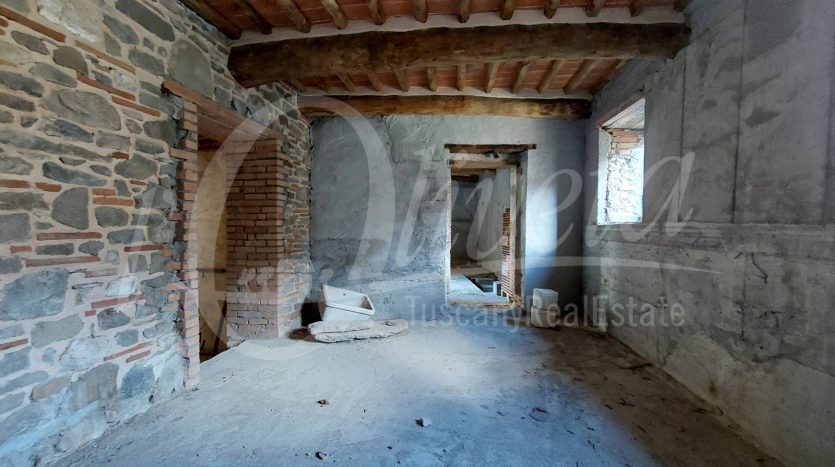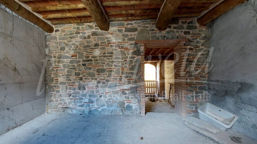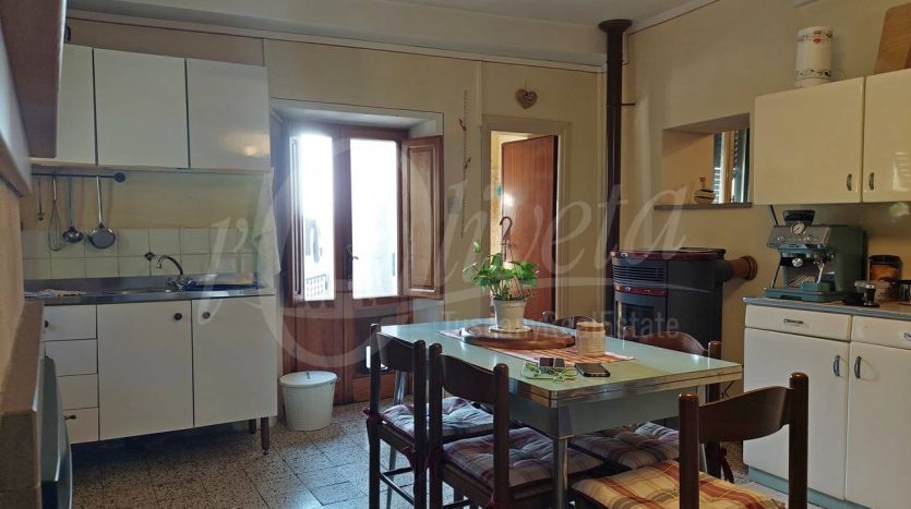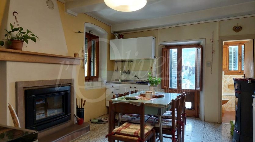 – L’immobile 1 è stato in parte ricostruito e in parte ristrutturato nel rispetto dell’attuale normativa antisismica, privilegiando l’utilizzo dei materiali tipici delle vecchie case in pietra, come il legno di castagno, la pietra locale e il cotto. Al piano terra si compone di un ingresso, una cucina spaziosa, un bagno e un ampio soggiorno, da cui si accede sia alla corte interna privata che alla via pubblica del paese.