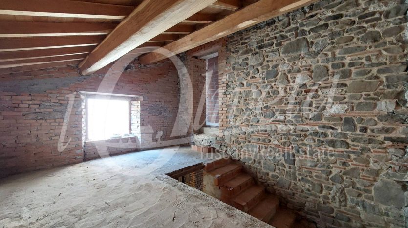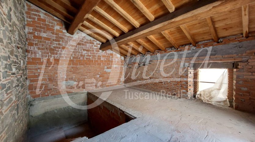 Al piano superiore la scala si affaccia su di un grande locale disimpegno, da cui si accede alla zona notte, composta da disimpegno, un bagno e due locali mansardati da destinare a camere da letto.