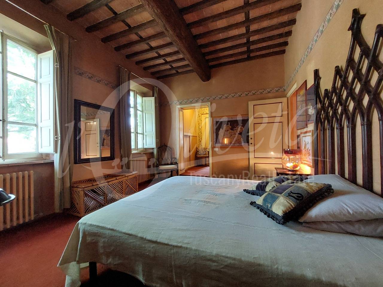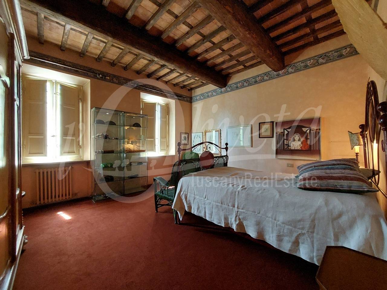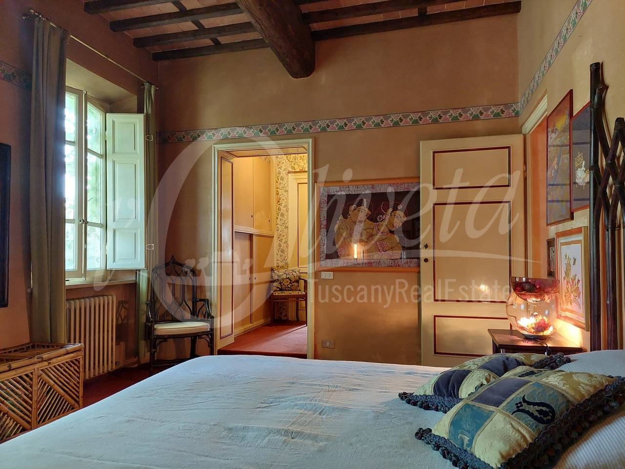 Salendo la scala in pietra con elegante ringhiera in ferro battuto, si accede al primo piano dove si sviluppa la zona notte, in cui si trovano un ripostiglio/cabina armadio, tre grandi camere matrimoniali, ciascuna delle quali con bagno en suite dotato di vasca o doccia.