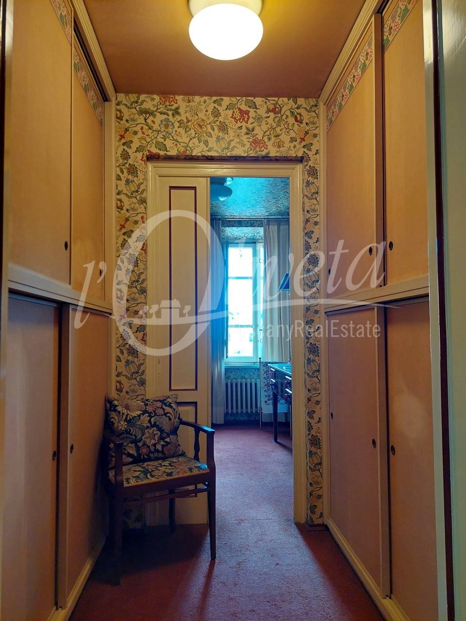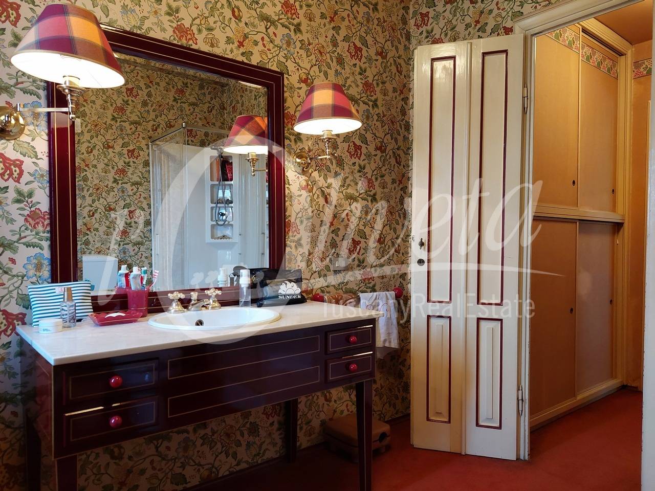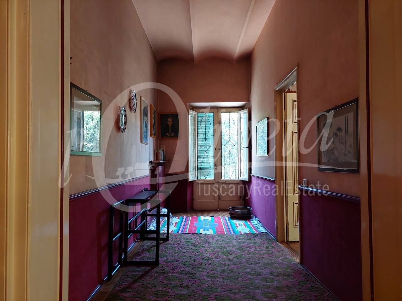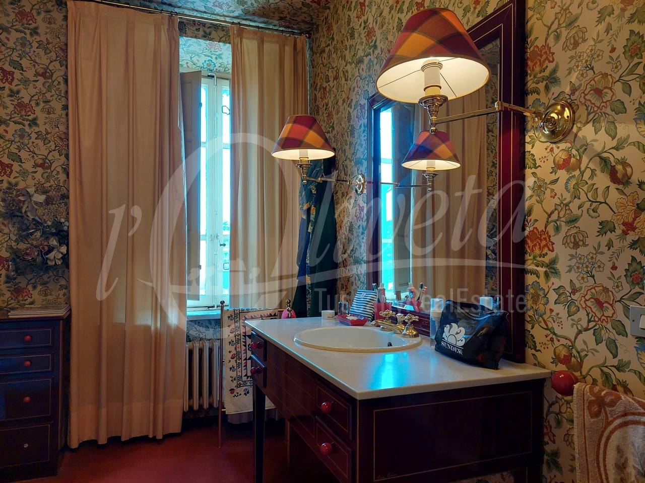 The house is in a good, well-maintained condition. The total renovation of the property dates back to the early 1990s and, at that time, top-quality materials were used. The walls are covered with wallpaper and fine fabrics, while the floors are carpeted with merino wool.